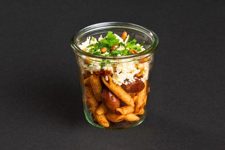 Penne | Feta | getrocknete Tomate | Kalamata Olive | Pinienkerne | Pesto