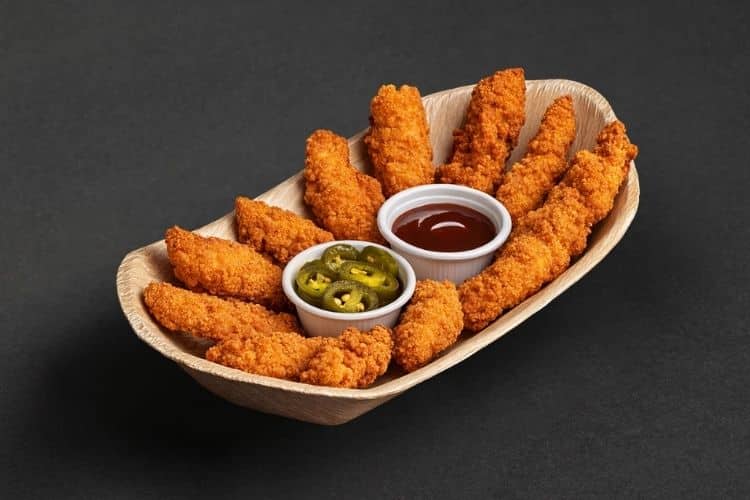 Knusprige Chicken Finger aus zarter Hähnchenbrust, serviert im Palmblatt-Boot mit BBQ-Dip und Jalapeños. Perfekt für Business Catering in Berlin.