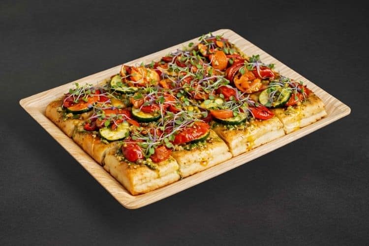 Italienische Focaccia mit mariniertem Antipasti-Gemüse, frischem Pesto und Sprossen. Serviert auf nachhaltigem Palmblatt-Tablett, perfekt für Business Catering, Meetings und Events in Berlin.