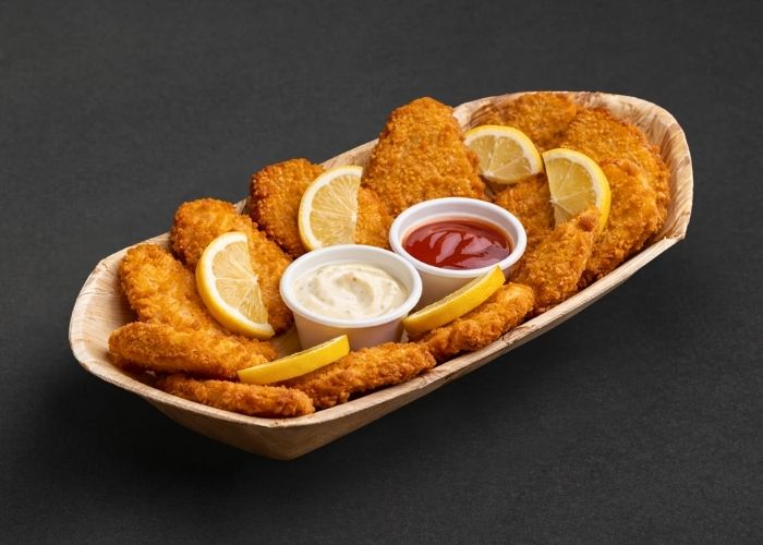 Mit unserem Schnitzel Boot erhalten Sie gleich ein Dutzend leckerer kleiner Happen serviert. Wir setzen in diesem Fall auf leichtes und bekömmliches Hühnerfleisch. Dazu gibt es Zitronenscheiben, Tomatenketchup und Remoulade.