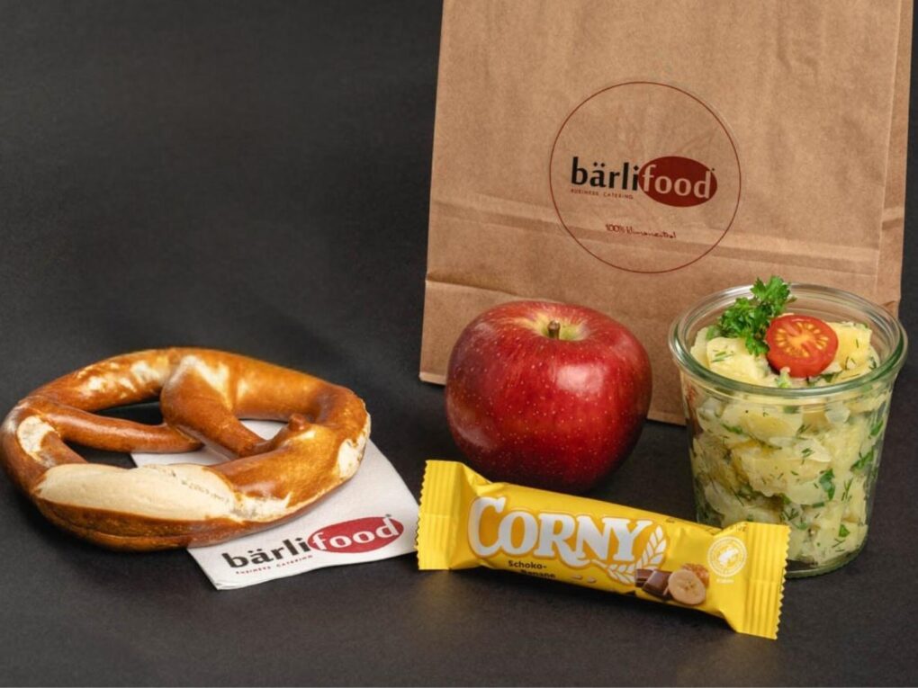 Bayerische Butterbrezel | Handobst | Kartoffelsalat | Müsliriegel | Serviette