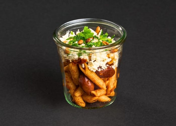 Penne | Feta | getrocknete Tomate | Kalamata Olive | Pinienkerne | Pesto