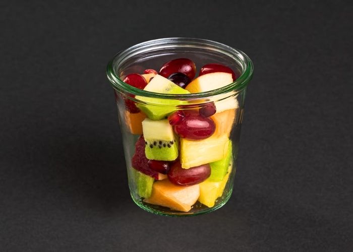 Schlagwörter: Früchte, Obstsalat, vegan, Weckglas