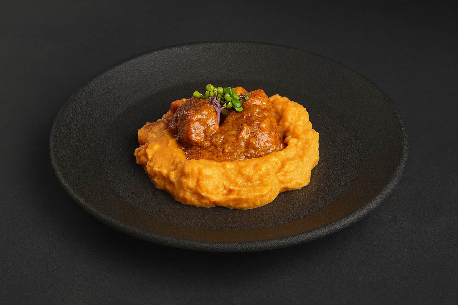 Butter Chicken mit cremiger Sauce und gestampfter Süßkartoffel. Ein beliebtes Gericht für Lunch Catering in Berlin für Unternehmen.