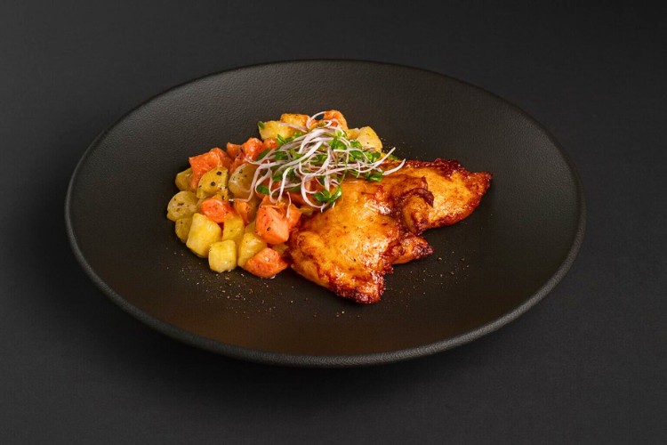 Knusprig gebackenes Hähnchenfilet mit aromatischem Wurzelgemüse aus Karotten und Kartoffeln. Ein leckeres Gericht für Business Lunch und Firmen-Catering in Berlin.