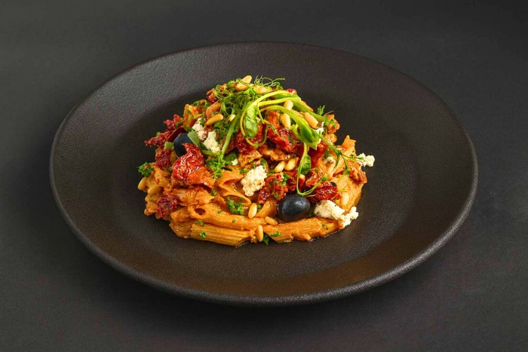 Penne | Feta | getr. Tomate | Pinienkerne | Olive | Pesto Genovese