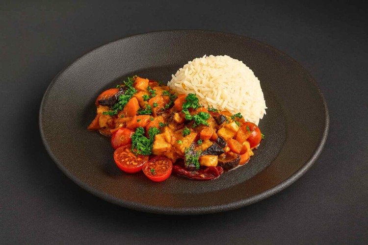Ratatouille mit Paprika, Zucchini und Aubergine in Tomatensauce, serviert mit Reis. Vegan, sättigend und oft gefragt beim Team-Catering in Berlin.
